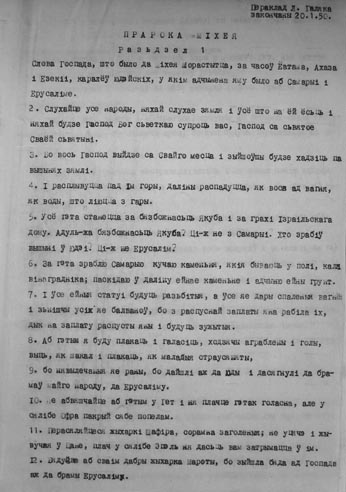 1. Слухайце, што гаворыць Гаспод: – устань, спрачайся з гарамі і няхай чуюць узгоркі твой голас. 2. Слухайце горы суд Госпада і вы, наймацнейшыя падставы зямлі, бо Гаспод вядзе спрэчку з народам сваім і з Ізраілям вядзе спор. 3. Народ мой! Што зрабіў Я табе і чым упрыкрыўся, адказывай мне. 4. Я вывеў цябе з Эгіпскай зямлі і выкупіў цябе з дому нявольнікаў і паслаў перад табою Масея, Арона і Марыям. 5. Народ мой, успомні цяпер, што задумываў Балак, Маабскі Кароль, і што адказаў яму Балаам, сын Бэора; успомні таксама, што дзеялася ад Сытыма да Галгала, каб пазнаць справядлівасьць Госпада. 6. Але гаворыш: – з чым зьяўлюся перад Госпадам і пакланюся Найвышэйшаму Богу. Зьявіцца мне перад Ім з цэлапальнай ахвярай з гадавымі цёлкамі? 7. Ці-ж можна дагадзіць Госпаду тысячамі авечак ці патокамі алею? Ці-ж аддам яму майго першака за злачынства маё і плод улоньня майго за грэх душы маёй? 8. Сказана табе, чалавек, што дабро і чаго патрабуе ад цябе Гаспод: дзеяць справядліва, любяць міласэрнасьць і пакорна хадзіць перад тваім Богам. 9. Голас Госпада кліча да места, але растаропны сам аглядаецца на Тваё імя; слухайце ляску і Таго, хто паставіў яе. 10. Ці-ж не знаходзяцца і цяпер у доме бязбожнага нясправядлівыя скарбы і агідная зьменшаная мера. 11. Ці-ж магу я быць чыстым з няправільнай вагою і сфальшаванымі адважнікамі ў торбе. 12. Багацьці яго поўныя няпраўды і жыхары яго гавораць ману і язык іх манлівы ў вуснах іх, 13. Дык і Я паражу цябе спусташэньнем за грахі твае. 14. Ты будзеш есьці і ня будзеш сыты; пустата будзе ў тваім нутры; будзеш хаваць, але не ўхаваеш, а што ўхаваеш, тое перадам мячу. 15. Будзеш сеяць, але ня будзеш жаць; будзеш выціскаць аліўкі, але ня будзеш мазацца алеям; выцісьнеш вінаградны сок, але ня будзеш піць віна. 16. Захаваліся ў вас звычаі Амбрыя і ўсе справы дому Ахаба і паступаеце згодна з іх радамі, і я выдам цябе на спусташэньне і жыхароў тваіх на насьмешкі і вы будзеце насіць ганьбу Майго народу.